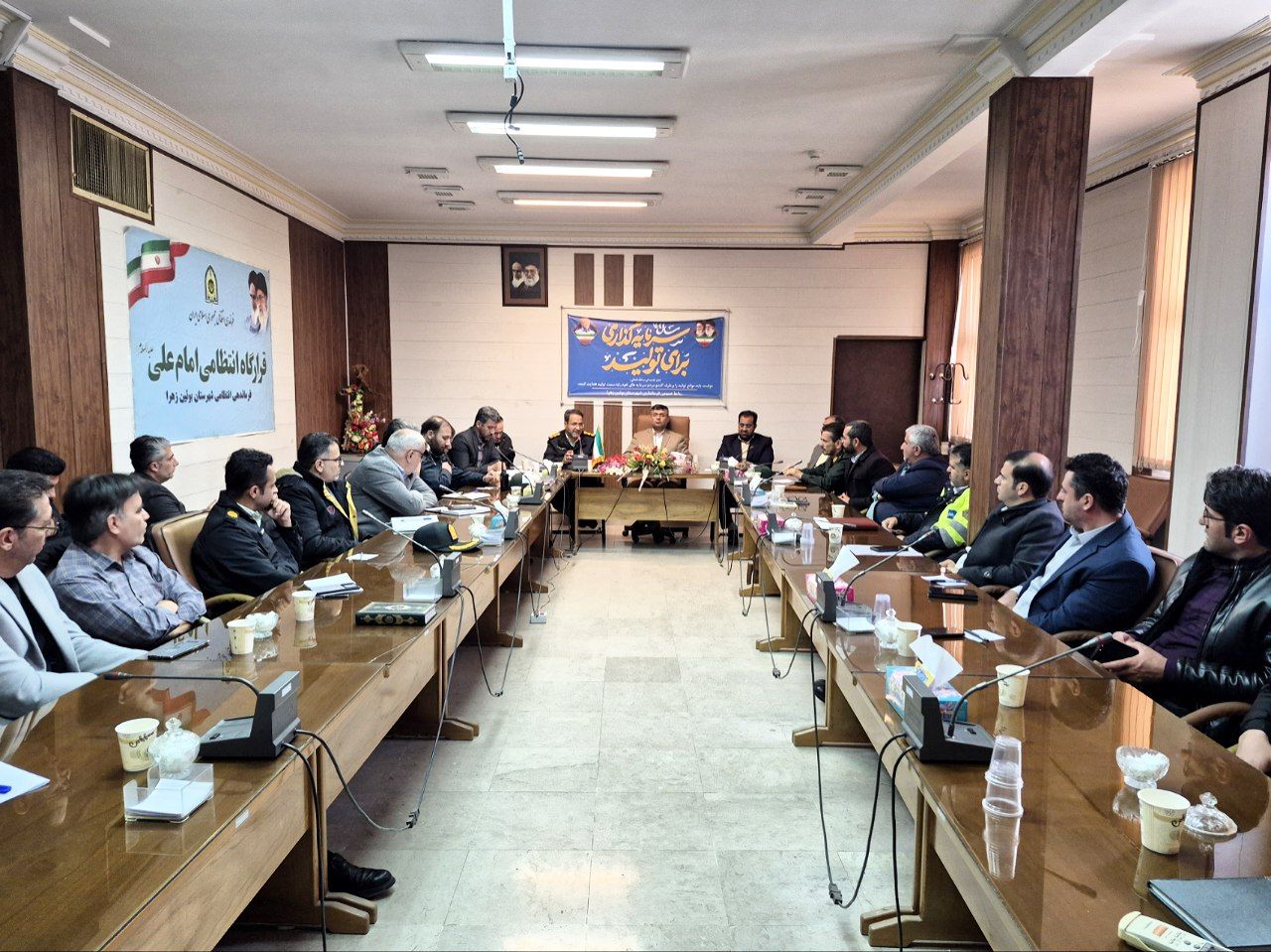 جلسه قرارگاه انتظامی امام علی (ع) با ریاست مصطفی صالحی فرماندار بوئینزهرا و با حضور اعضای شورای تأمین، بخشداران، شهرداران و جمعی از مسئولین در محل فرمانداری برگزار شد.